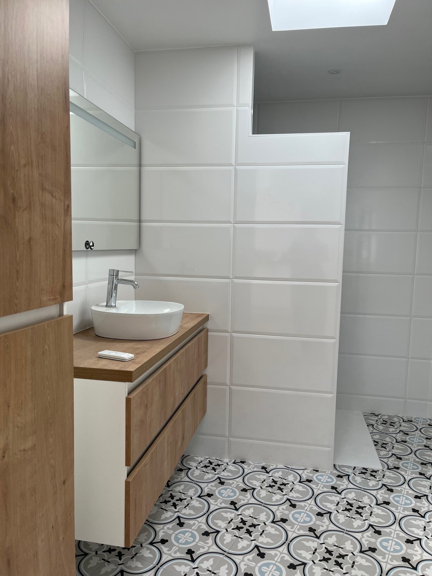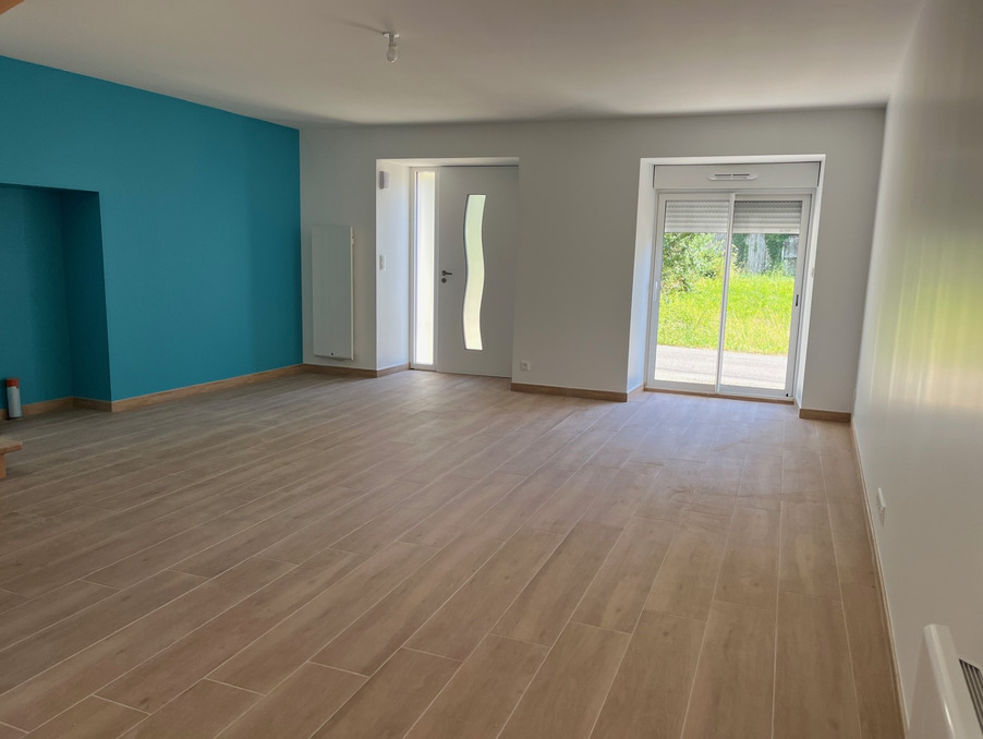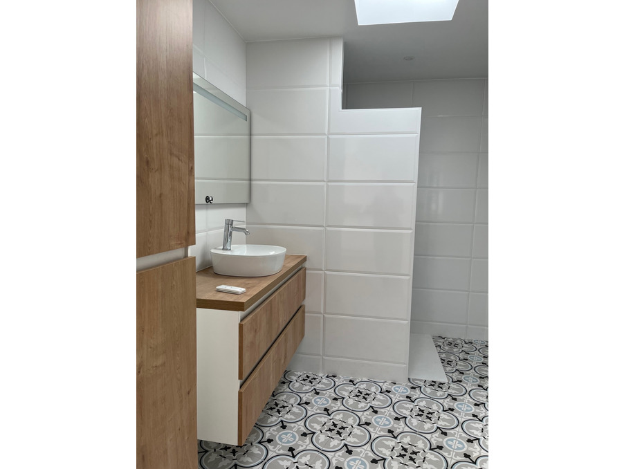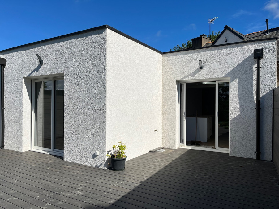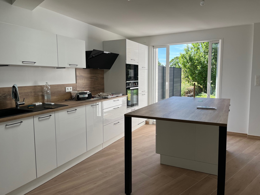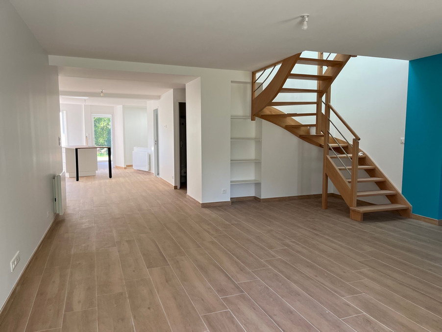 Côté VILAINE, maison mitoyenne des 2 côtés, entièrement rénovée, composée d'un vaste salon séjour prolongé par une cuisine équipée et aménagée, donnnant sur terrasse, un bureau, une chambre, une salle d'eau, un wc et une buanderie.